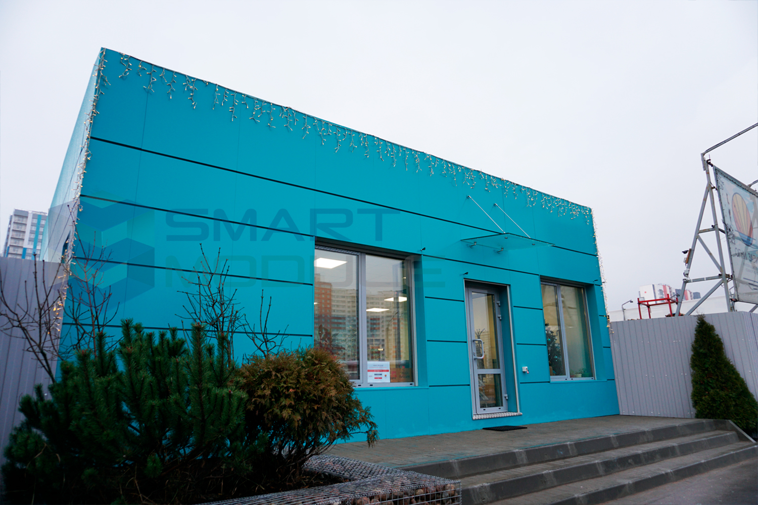 Навесной фасад из алюминиевых композитных панелей с 3-х сторон модульного здания. RAL 5018 TURKISBLAU